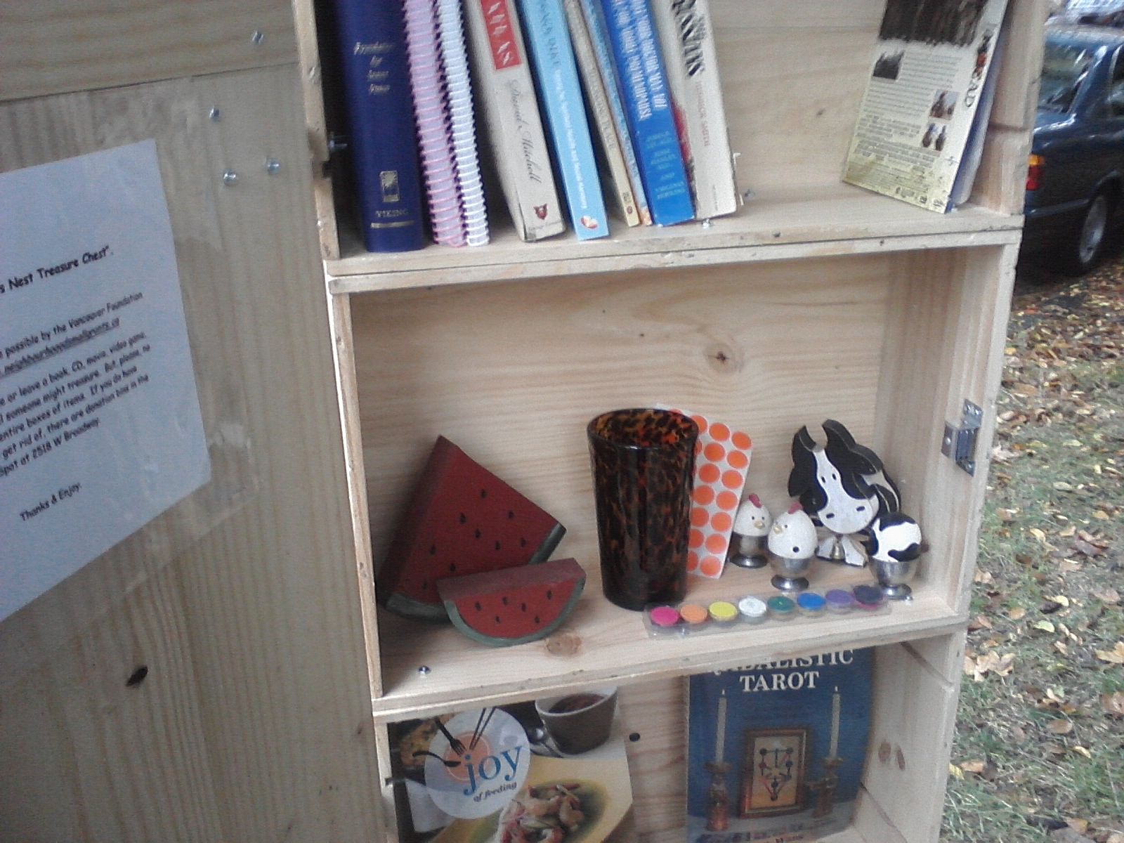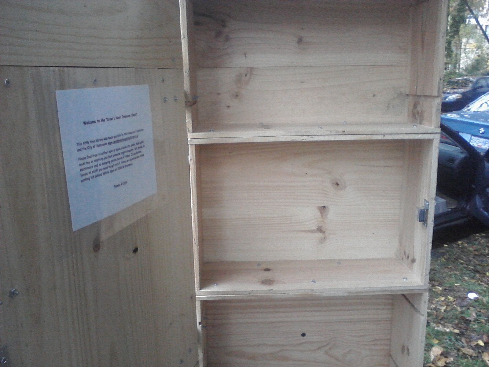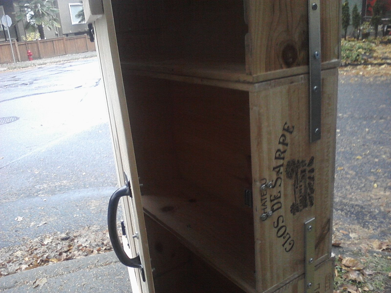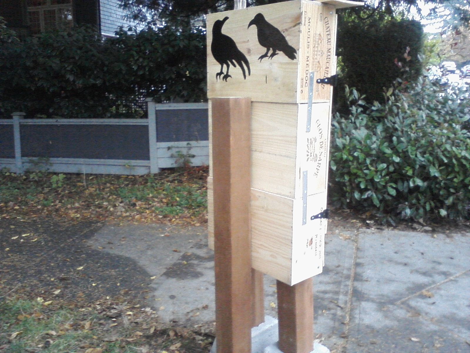 This is the little free library I made.   Its located on the corner of West 5TH Ave & Trafalgar Street in the Kitsilano neighbourhood of Vancouver BC.  I received a grant from the Vancouver Foundation who encouraged recipients to use recycled materials so I made it from wooden wine crates.  Most little free libraries are for books & mine is too but I also wanted mine to allow people to pass along anything they thought someone else might treasure.  I know if I was a kid, I would be checking it everyday for a toy.  I think it turned out well.  Some neighbours helped me install it.