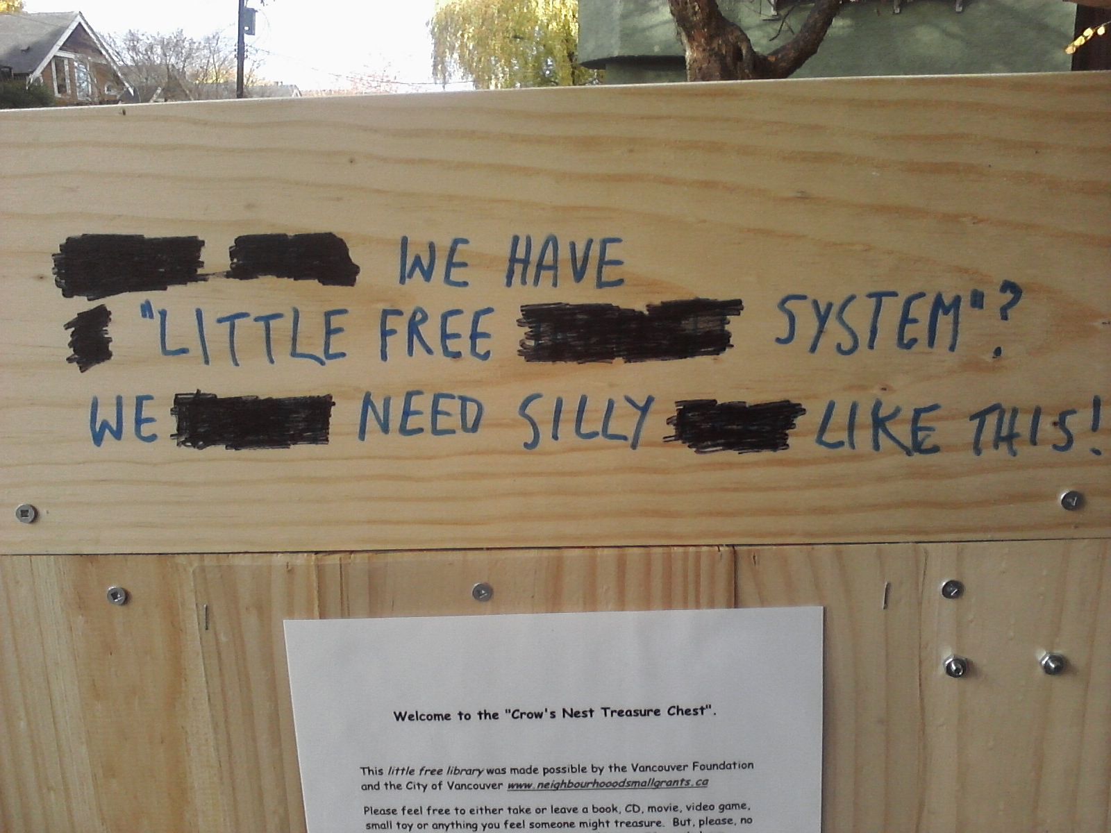 LFL graffittiUnfortunately, after only 2 weeks it was vandalized.  Fortunately its on the inside of the door & the swear words were already blacked out by the time I found the graffiti.  I am considering painting over it with black chalkboard paint & leaving a piece of chalk so people can write their thoughts without doing permanent damage.
